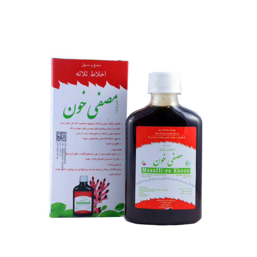 شربت مصفی خون در طب سنتی از ارزش بالایی برخوردار است. چرا که علاوه بر تنظیم طبع و اخلاط بدن، سبب بهبود عملکرد یکی از مهم‌ترین اعضای بدن یعنی کبد می‌شود. داروی گیاهی مصفی خون حاوی گل محمدی و بنفشه و شاهتره . عناب و پرسیاوشان و شکر سرخ و آمله و کاسنی است.
