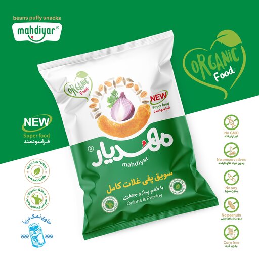 • پفک مهدیار بدون ذرت، بر پایه حبوبات و جوانه غلات و با طعمدهنده خوشمزه پیاز جعفریه که بین همه افراد محبوب و پرطرفداره.