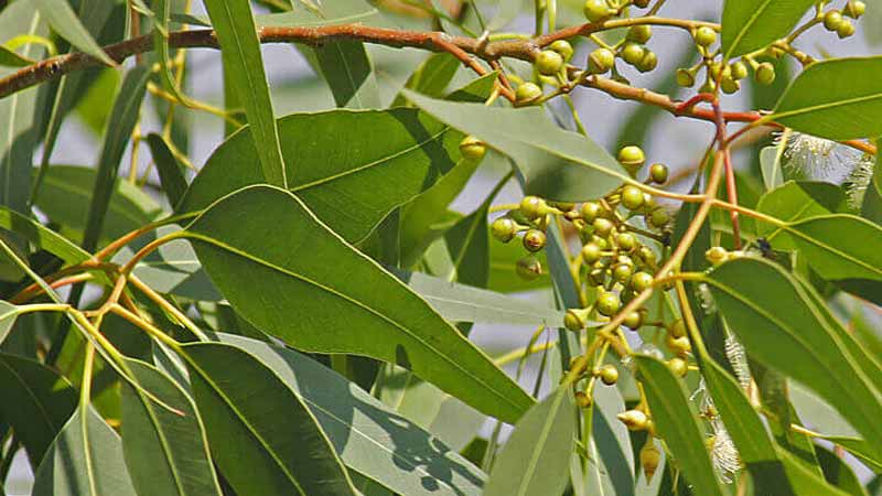 عنصر اصلی این گونه درخت ها برگ های سبز مایل به خاکستری آن است. این برگ ها بزرگ، ضخیم و چرمی هستند و دارای ظاهری نیزه ای شکل هستند. وقتی برگ ها خرد می شوند، عطر و روغن قوی تولید می کنند که ممکن است برای مصارف زیادی استخراج شود. برگ ها این درخت جمع آوری شده و خشک می شوند تا از آنها یک فنجان دمنوش شفابخش تهیه شود.