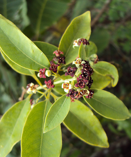 برگ های این گیاه برنده و نوک تیز هستند و بصورت متقابل روبروی هم قرار گرفته اند. ابعاد برگ های صندل سفید به مانند برگ گردو می باشند. گل های آن به شکل خوشه هایی ساده هستند. میوه ی این گیاه به مانند یک تخم مرغ با یک هسته در وسط آن است.
